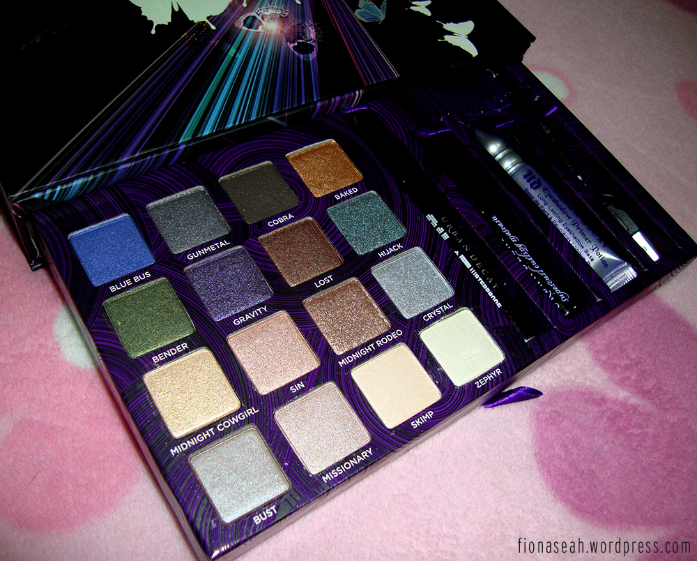 It has 16 shades of eyeshadow, a mini UDPP, eyeliner in Perversion, mini speaker and some pop-up butterflies near the mirror.