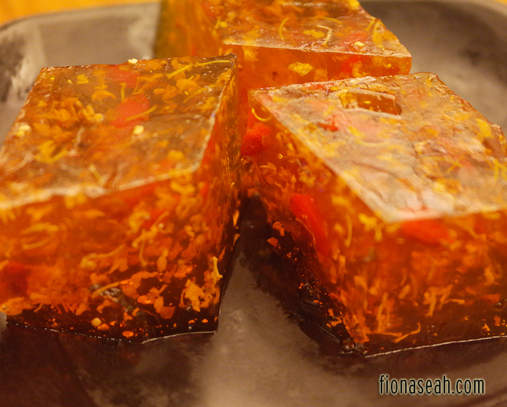 Don’t know why it’s called a cake when it’s obviously jelly. But whatever it is, this has a really unique appearance and taste. Called Tonic Medlar and Osmanthus Cake in Singapore, it’s served cold and has this pleasant fruity taste which I find really appealing. However, being jelly-like, I had difficulty transporting it onto my plate because it kept slipping off my fork and chopsticks! Grrr.. I think I need to attend classes on handling utensils.