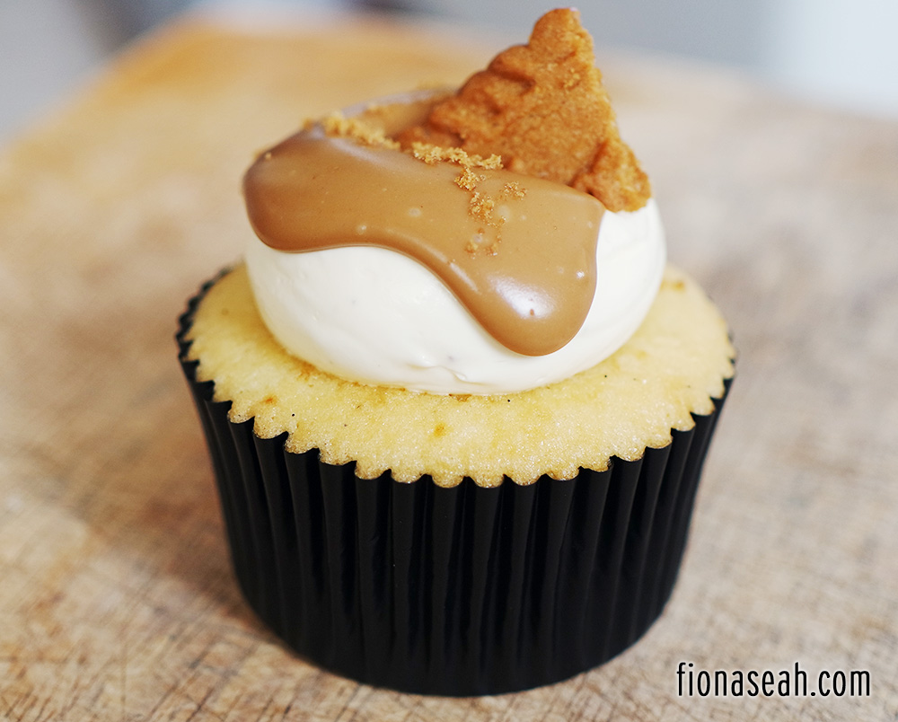 Speculoos Cookie Butter is a classic vanilla bean cupcake with Speculoos cookie butter filling topped with buttercream, cookie crumbs and a fraction of a caramalised biscuit.
