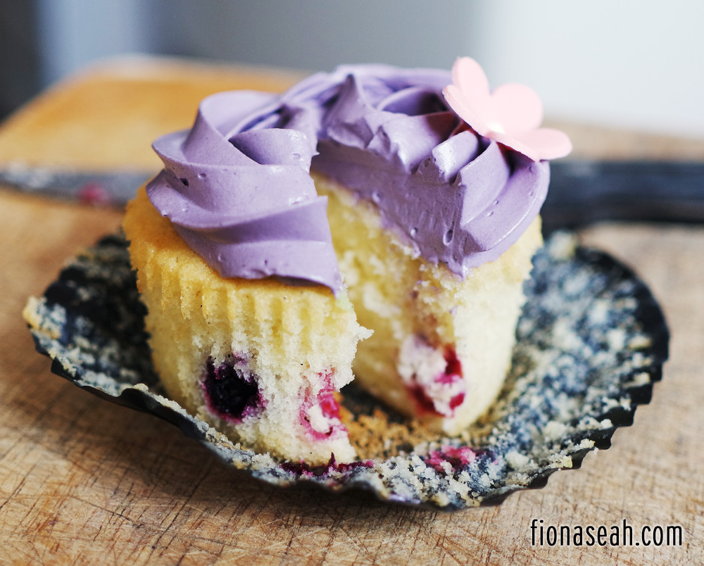 Forest Berries is a classic Madagascar vanilla bean cupcake baked with forest berries and topped with blackcurrant buttercream.