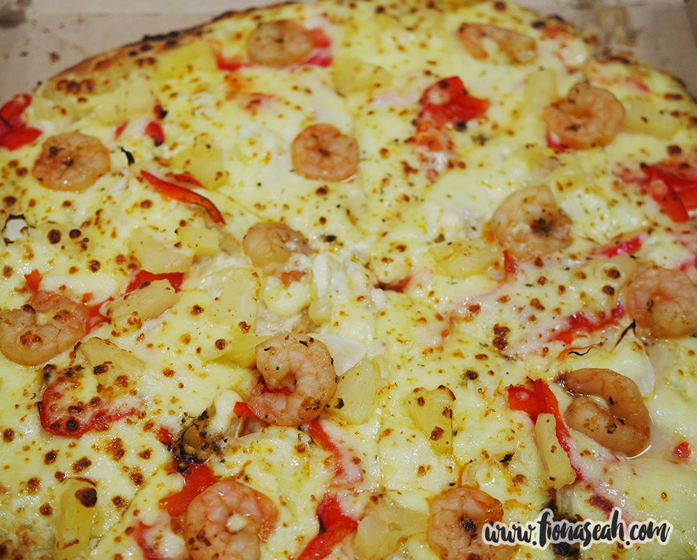 Alfredo Prawn – “onion, red pepper, pineapple, prawns, mozzarella cheese on Top Secret sauce” (surcharge applies)