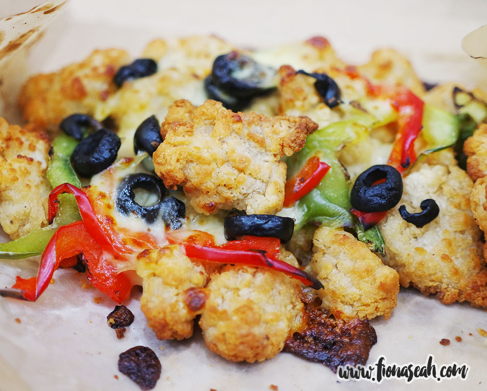 Meatzza – “100% mozzarella cheese with succulent smoked chicken breast, chicken ham, chicken sausage, cabanossi, beef pepperoni and ground beef” (surcharge applies)