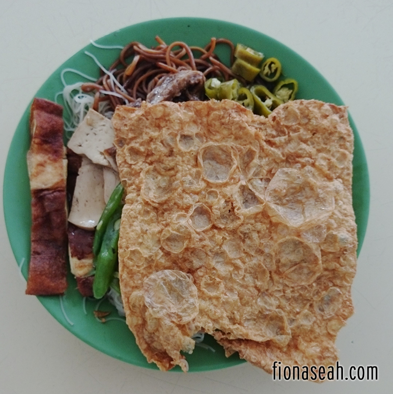 Mixed Beehoon and Noodles with some mock meat and a large piece of crispy bean curd skin