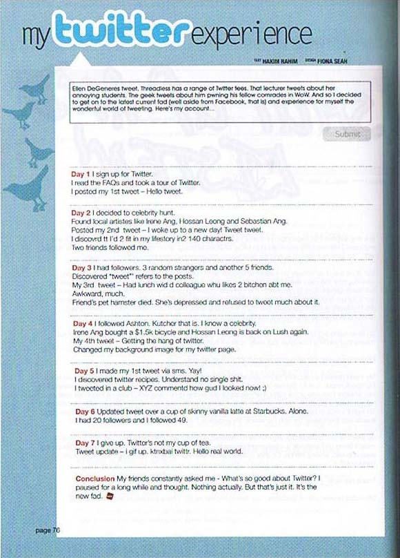 One of the layout design I did for a campus publication. The theme for this was Twitter and I did a mock-up of Twitter interface.